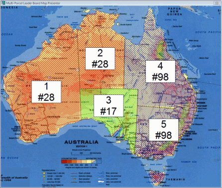 To the right is an example of our map leader board. As you can see this feature starts with an aerial shot and then overlays the parcels with color coded shading to indicate who is currently the leader on a particular parcel or combination of parcels.